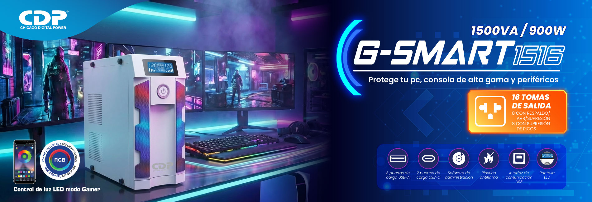 UPS CDP GAMING G-SMART1516I 1500VA / 900W / 16 SALIDAS / 8 PORT USB-A / 2 PORT USB-C BLACK (G-SMART1516I)